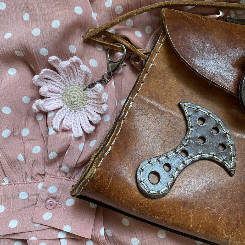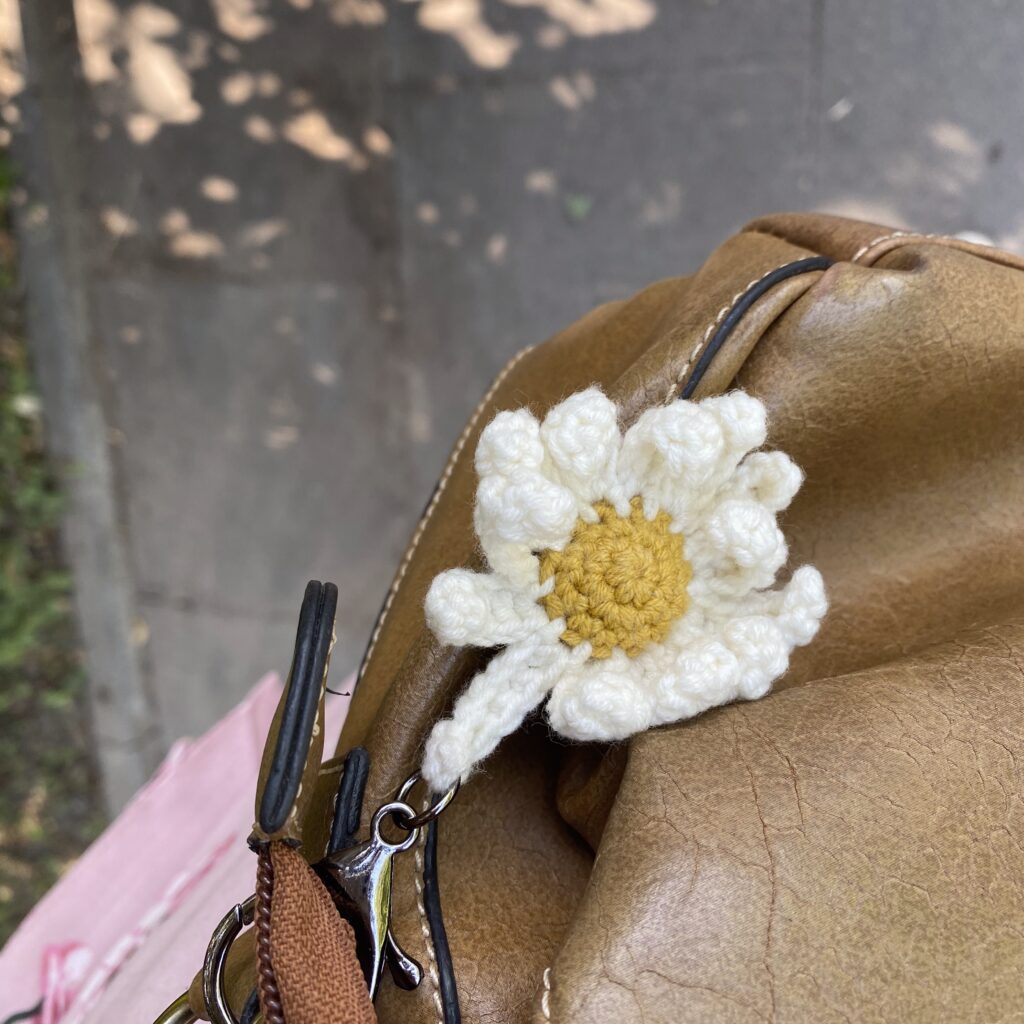 Breloczek kwiatek z włóczki Yarn-Art (skład: 55% bawełna, 45 % akryl). Wypełnienie to kulka silikonowa, posiada certyfikat Oeko-Tex® Standard 100.