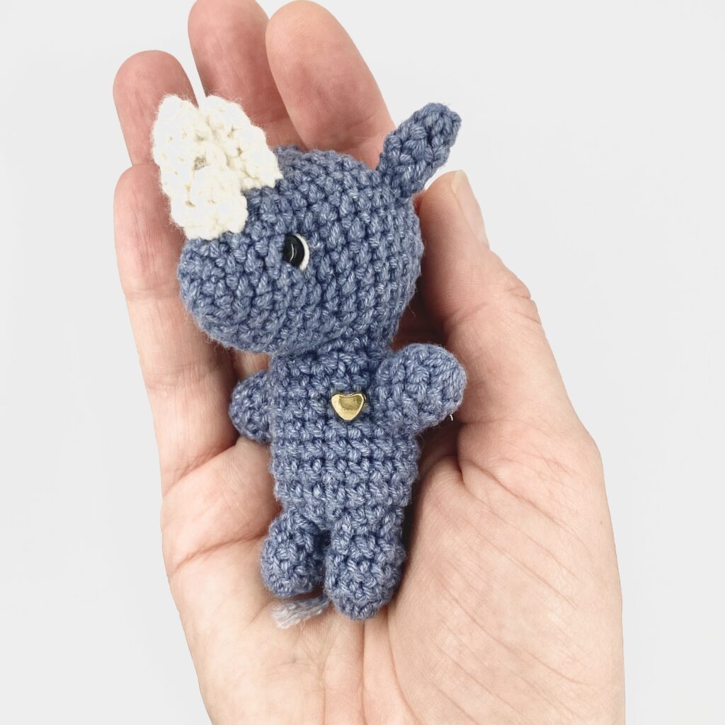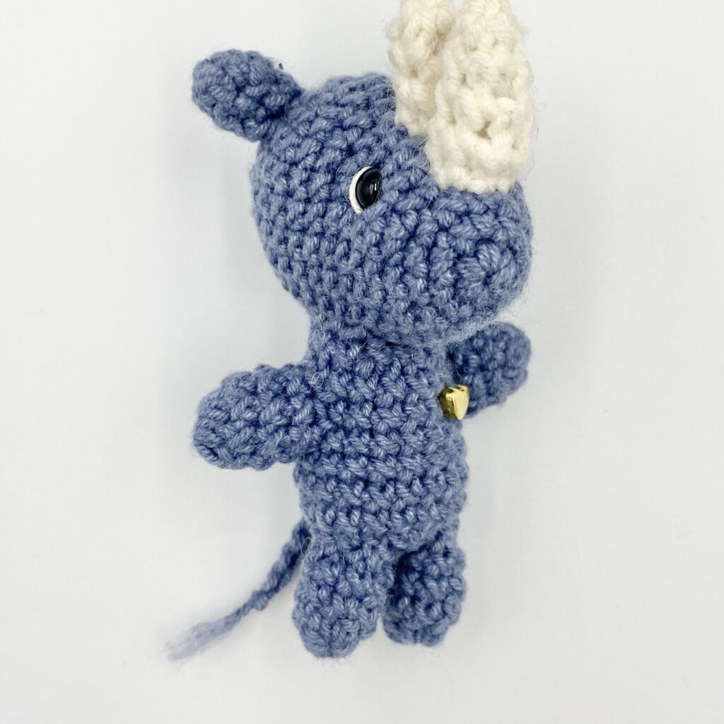Nosorożec wykonany z włóczki Yarn-Art (skład: 55% bawełna, 45 % akryl). Zastosowano bezpieczne oczka wykonane z plastiku. Wypełnienie to kulka silikonowa, posiada certyfikat Oeko-Tex® Standard 100. Serduszko przyszyte włóczką wykonane jest z plastiku. Nosorożec na życzenie może być breloczkiem albo przypinką.