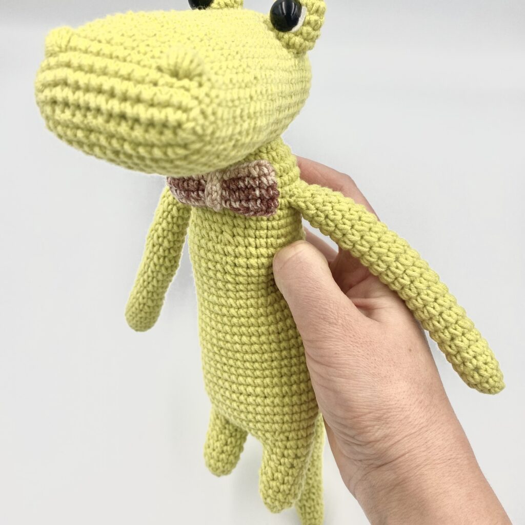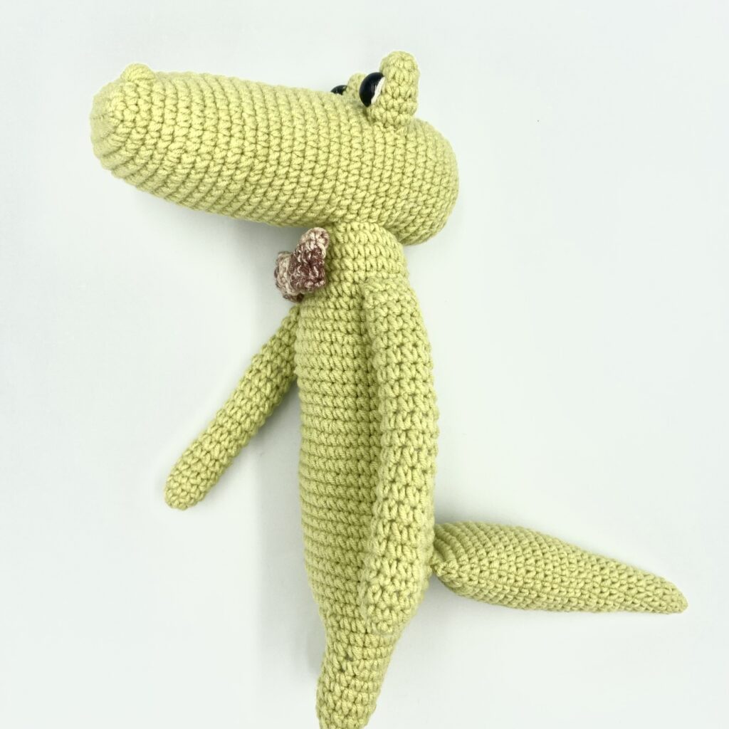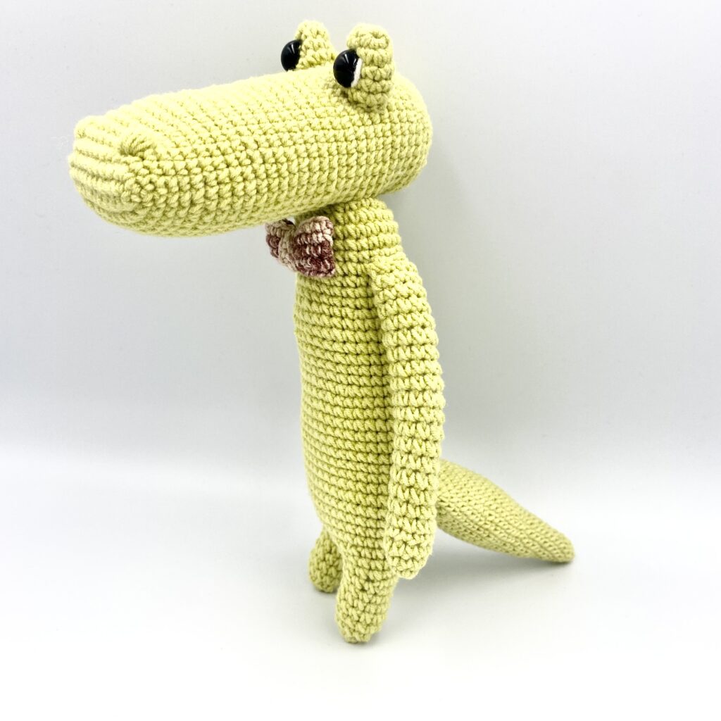Aligator wykonany z włóczki Yarn-Art (skład: 55% bawełna, 45 % akryl). Muszka przyszyta. Zastosowano bezpieczne oczka wykonane z plastiku. Wypełnienie to kulka silikonowa, posiada certyfikat Oeko-Tex® Standard 100.