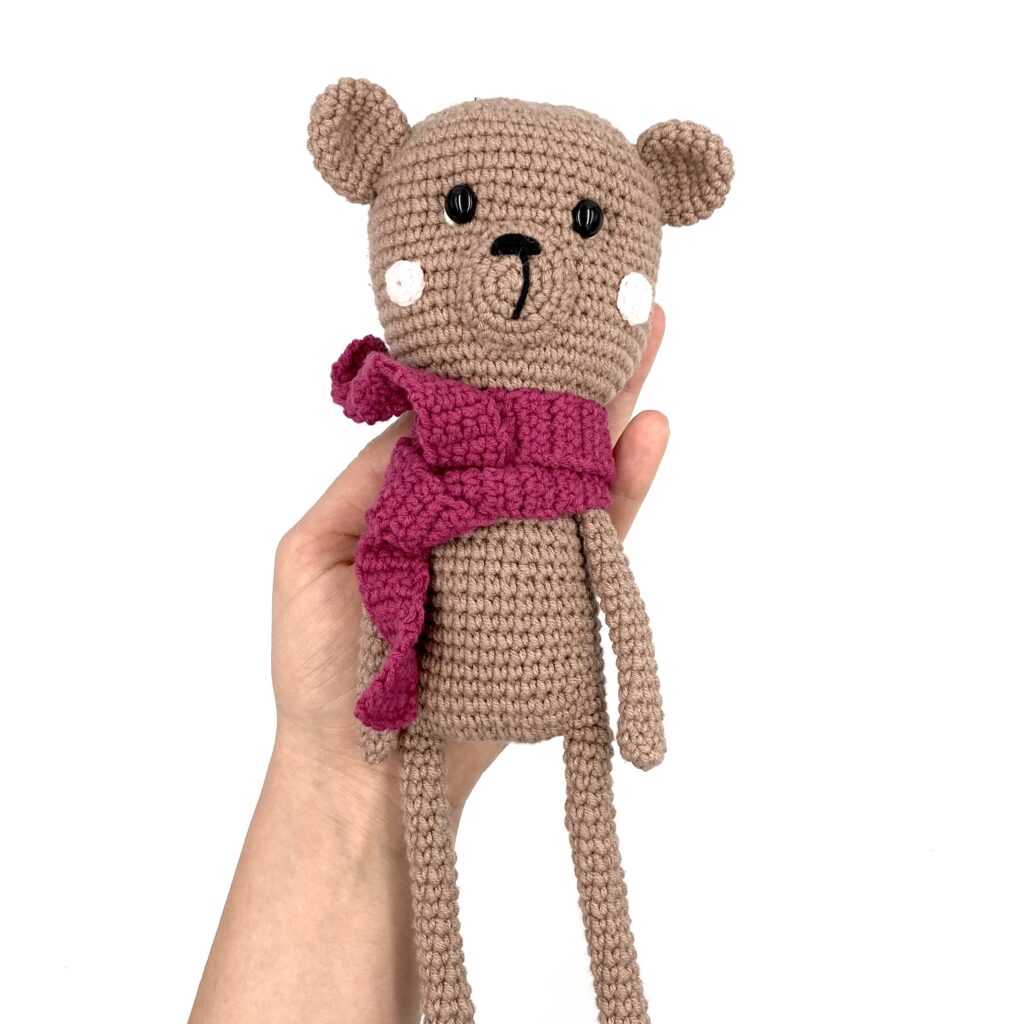 Miś wykonany z włóczki Yarn-Art (skład: 55% bawełna, 45 % akryl). Zastosowano bezpieczne oczka wykonane z plastiku. Wypełnienie to kulka silikonowa, posiada certyfikat Oeko-Tex® Standard 100. Rękawiczki i szalik zdejmowane w dowolnym kolorze gratis.