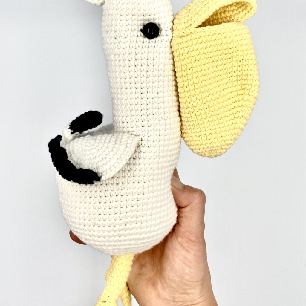 Pelikan wykonany z włóczki Yarn-Art (skład: 55% bawełna, 45 % akryl). Zastosowano bezpieczne oczka wykonane z plastiku. Wypełnienie to kulka silikonowa, posiada certyfikat Oeko-Tex® Standard 100. Rybka gartis.